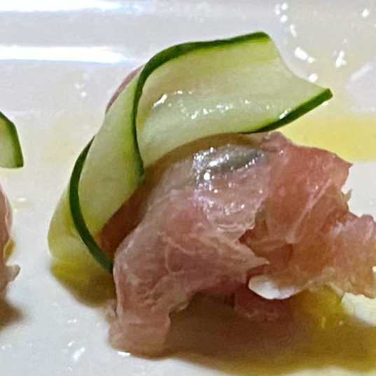 - 皿に乗せたキュウリ巻きに、できあがったオリーブオイルレモンをかけます。