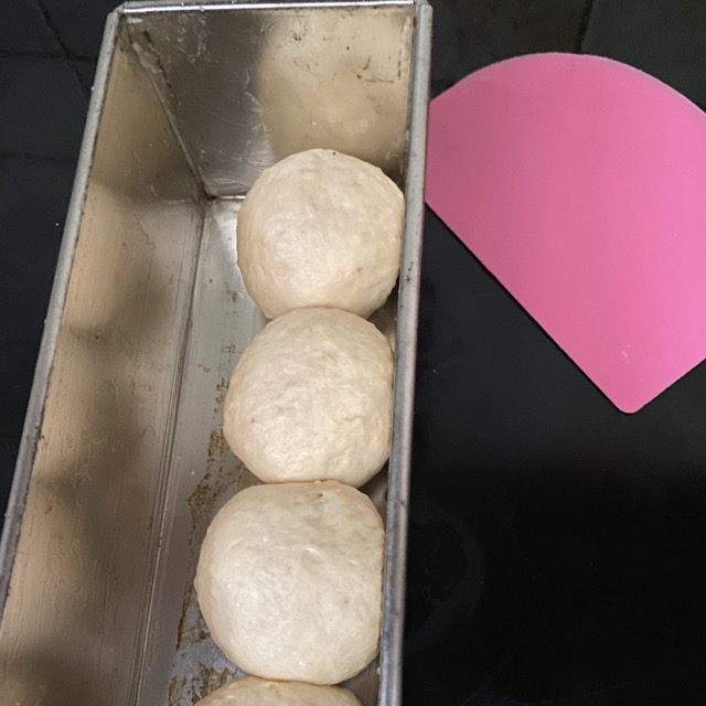 • 生地は発酵して伸びるので同じ間隔で並べます。発酵後の大きさをなるべくそろえるためです。また、発酵の進み具合を揃えるために、片側に寄せて並べます。画像ではパウンド型に焦げのようなものが見えますが汚れじゃありません(;^_^A パン生地がスポンと抜けるように焼き込みを行っているためにつくものです。はい。ちなみに使っている型はブリキ製です。