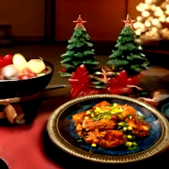 焼いて甘味を増した柿が、柔らかい和風ハニーチキン融合したクリスマス向け料理です。
