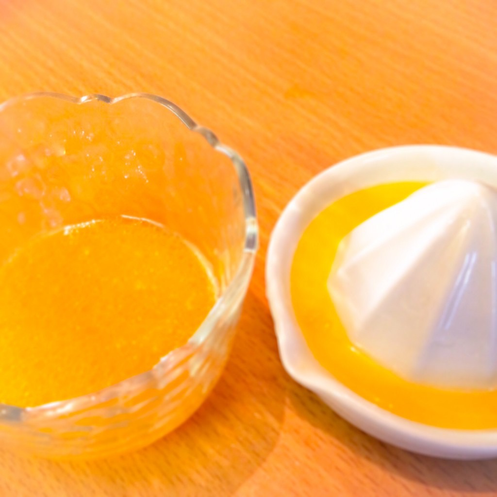 オレンジを絞ってオレンジ味のドレッシングを作ります。果肉も混ぜてフレッシュに仕上げます。